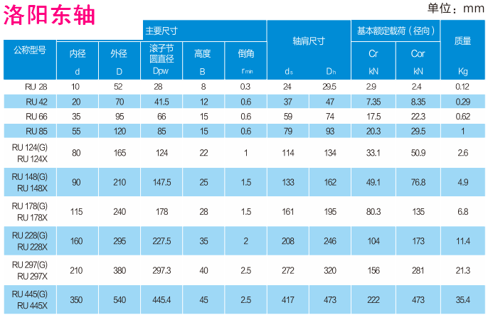 RU系列交叉滾子軸承型號(hào)尺寸規(guī)格表:
